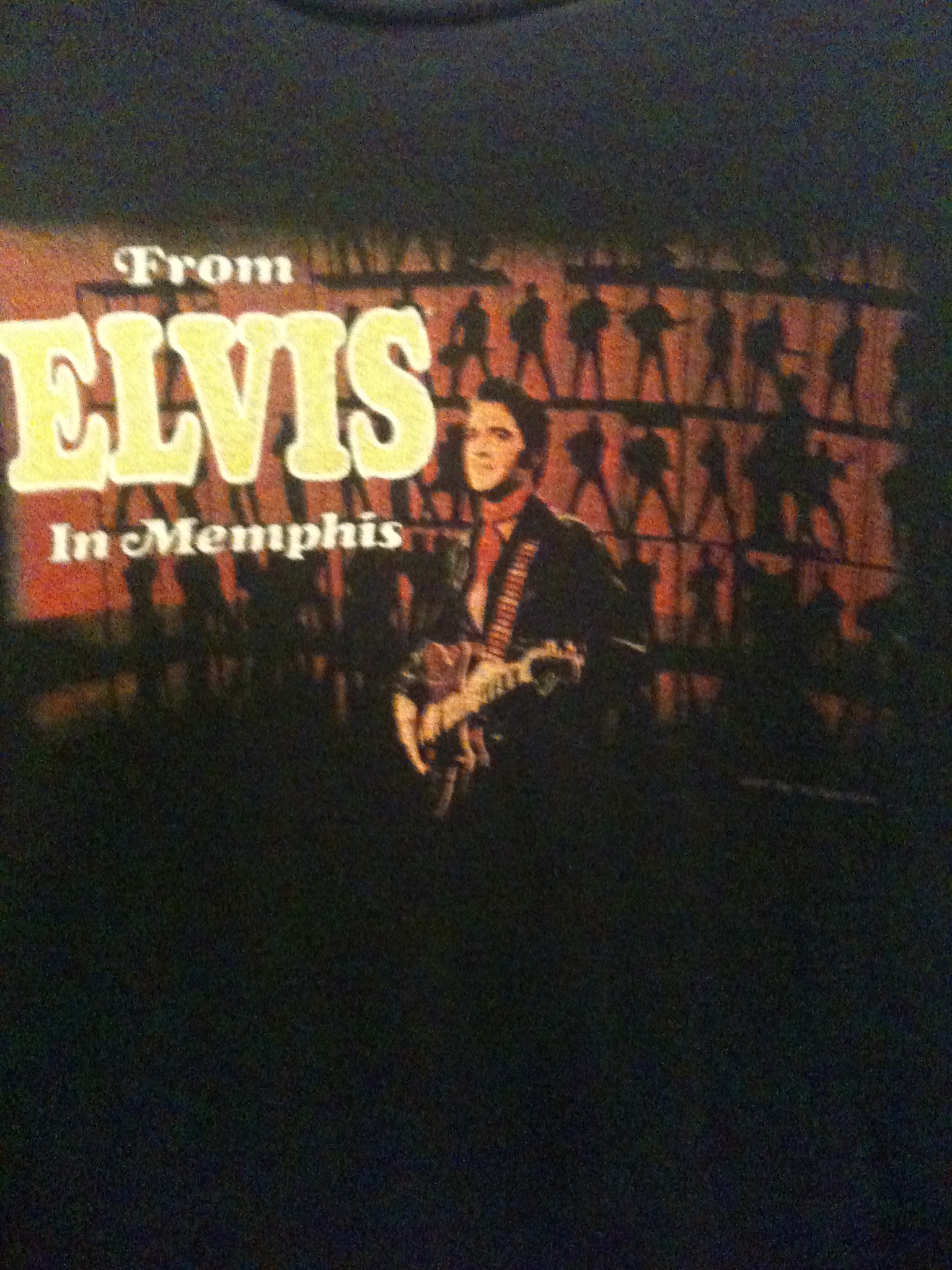 I have been an Elvis fan my entire life, so I have many, many Elvis tee shirts. I buy one for every Elvis week and birthday celebration that I attend. But there are a few that are my favorites that I wear over and over.