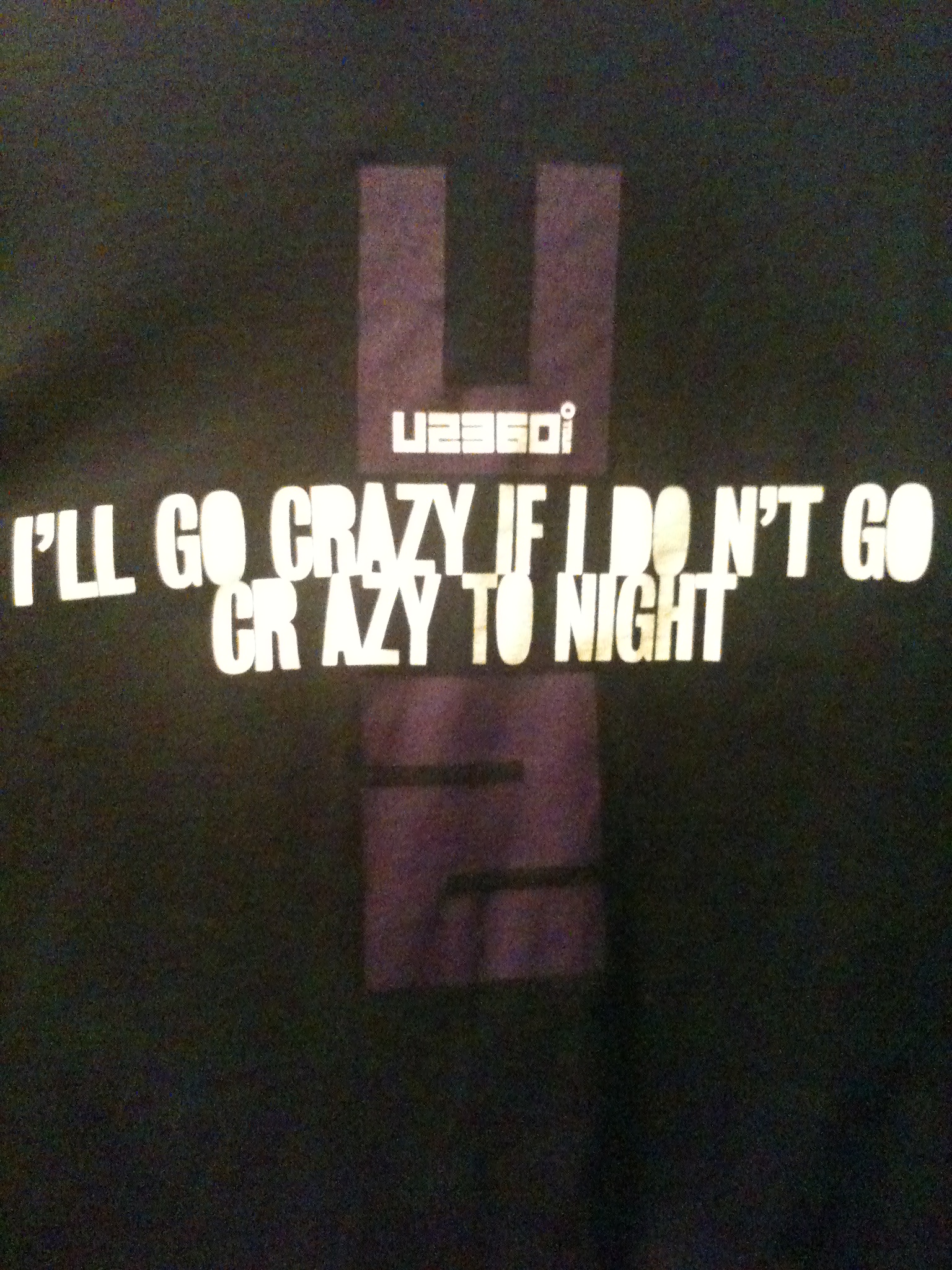 I used to buy several U2 tee shirts from each tour, but now the tee shirts are more expensive than the ticket to the concert. So for the 360 tour, I only bought the I’ll Go Crazy tee shirt.