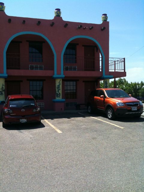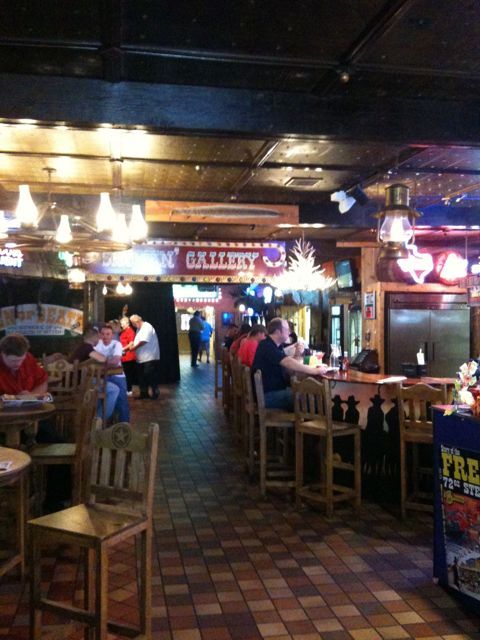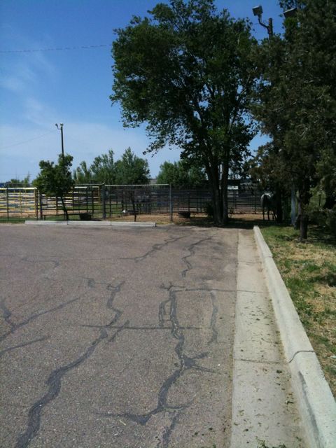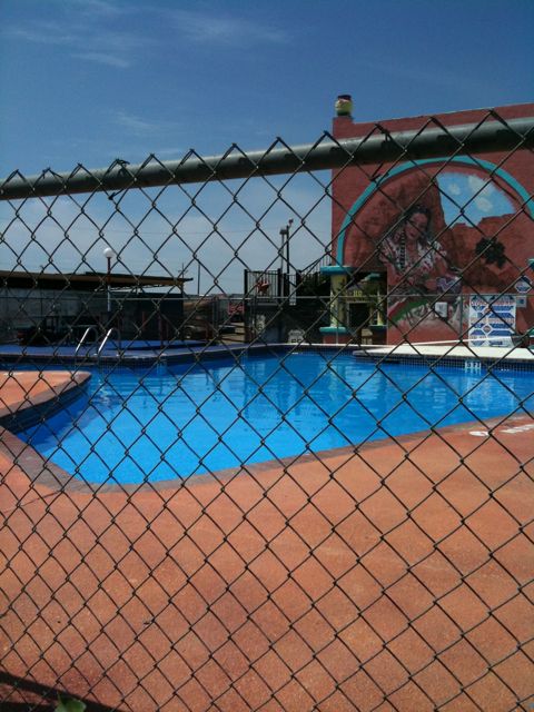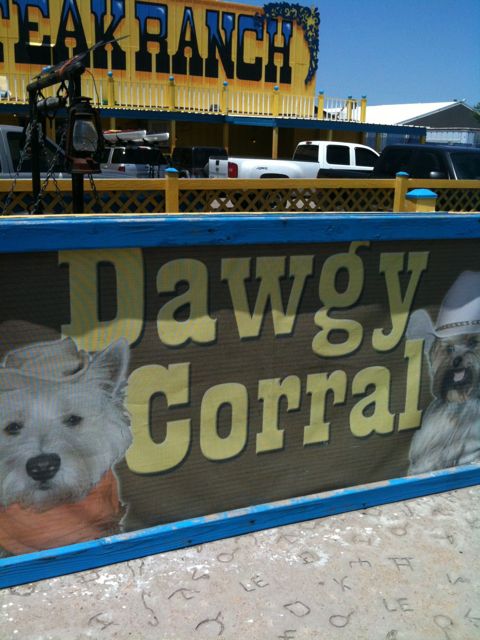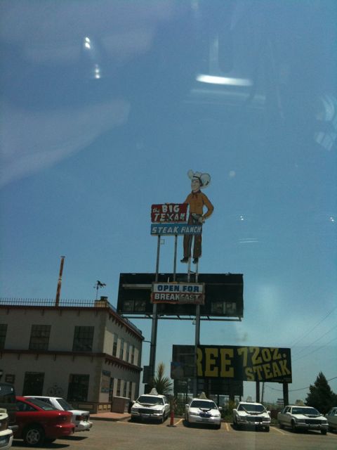 Then it was time for the Big Texan Steak Ranch! I’ve been waiting for this for a while. I have to admit that I first heard of the Big Texan on Tori & Dean’s show – they stopped there for dinner. Then I found out the Big Texan had a motel and they allow dogs! They even have a doggie corral where Elvis & Cilla can go off leash. They liked that. The hotel is really cool, but they put the dog people in the Alamo next to the horse hotel. The horses are literally right next to our room. Elvis barks at them thinking they’re big dogs. There is also a Texas shaped swimming pool and of course the famous Big Texan Steak House. Irony is I’m a vegetarian.