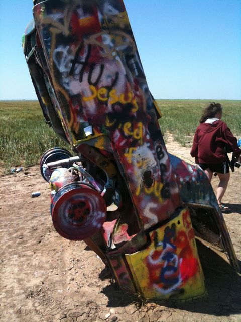 Finally we reached Amarillo. I love Amarillo! I was on the search for Cadillac Ranch. I had to circle it twice before finding the turnoff, but I found it. It was quite a little walk from route 40, and it was so windy I had dirt in my teeth. But it was cool. Just these Cadillacs in the ground where people graffiti.