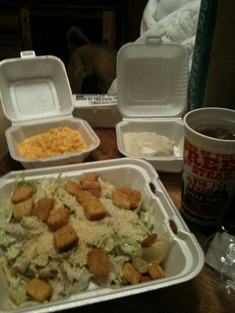 After Elvis, Cilla & I unpacked and took a nap, we wondered around the Big Texan. They enjoyed the freedom of the Dawgy Corral and had fun barking at the people walking by. Then Elvis & Cilla stayed in the hotel room while I went to get dinner. I ordered my carry out and bought souvenirs. It’s a really cool place with a restaurant, bar, arcade, shop. I was very impressed upon my return that Elvis & Cilla were not barking and had not destroyed anything. I thoroughly enjoyed my dinner, even without the steak.