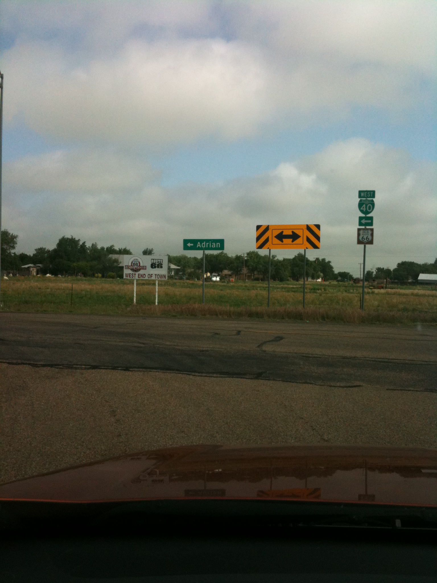 Next stop was the halfway point between Chicago and Los Angeles in Adrian, TX. As we were pulling off of Route 40 to get back onto Route 66, Elvis saw goats and started barking and the goats started running. He is a herding dog afterall.
