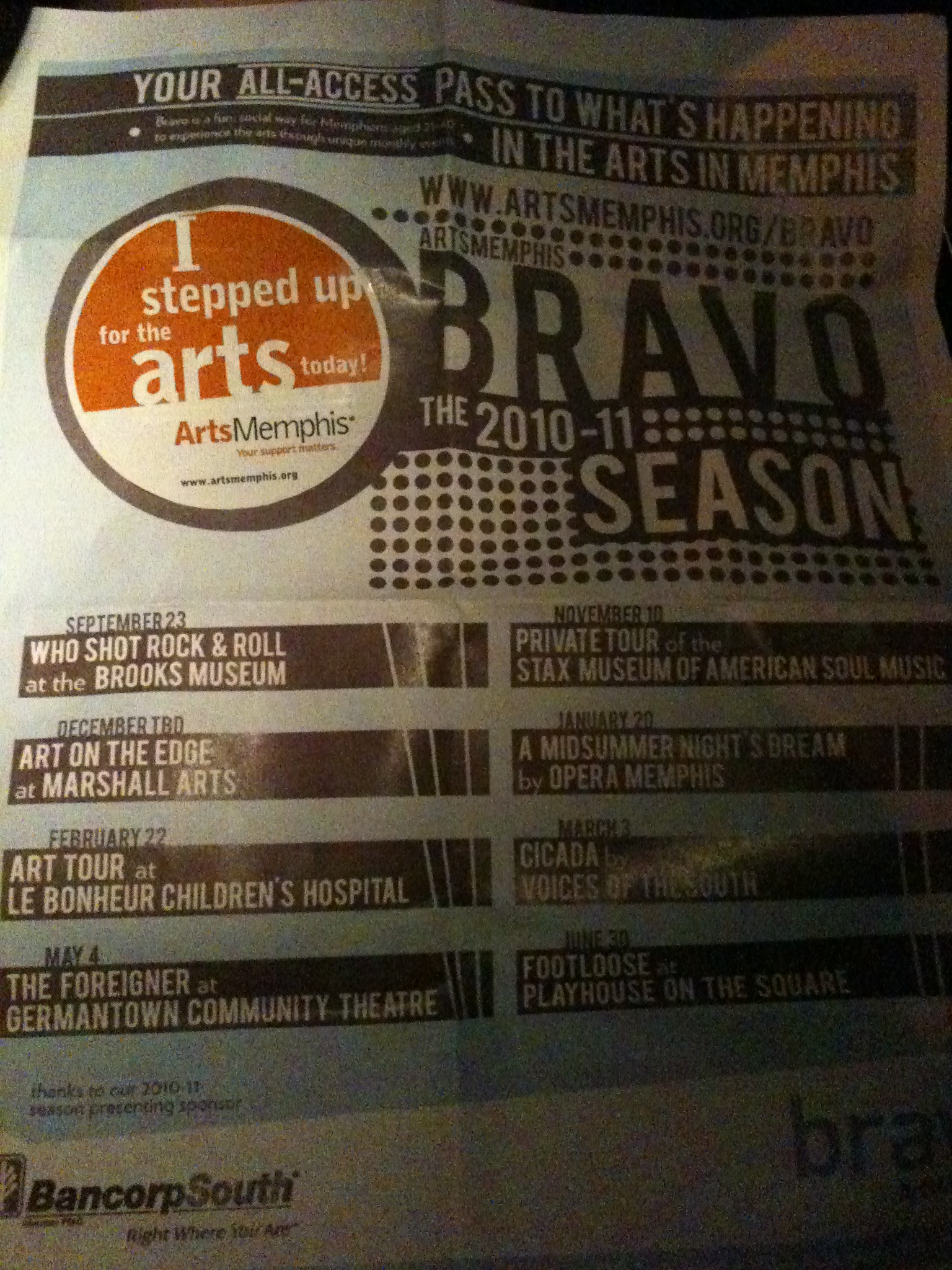 Please watch my video of the ArtsMemphis Bravo party http://www.youtube.com/watch?v=HHtlWq-sCgM