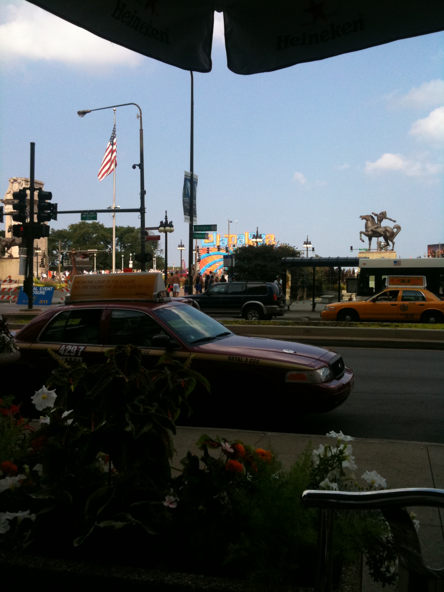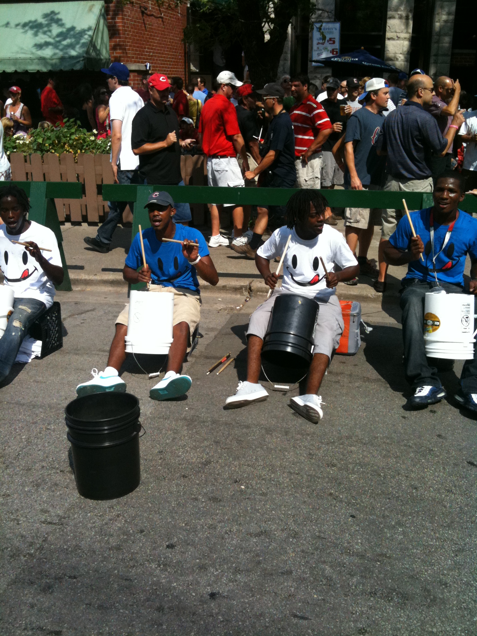 Walked around Wrigleyville after the game trying to find a cool little sports bar to have a beer, but everywhere was too crowded. I did see a lot of drums and a dog partying in a window. Decided instead to hang out on Michigan Avenue at the Congress Plaza Hotel bar outside and people watch across the street from the Lollapalooza entrance.