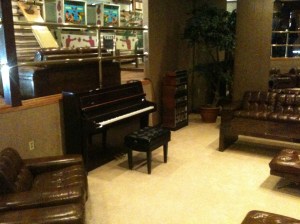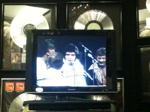I made my way through the backyard, the trophy room and into the racquetball court – another favorite spot for two reasons. First is Elvis’ piano. This is the piano on which he last played the night before he died – Unchained Melody. Second is a spot in the back corner of the racquetball court. It is a little tv showing footage from Elvis in Concert, which aired on CBS. It was from a June 1977 performance. I have been searching for this concert, but cannot find it anywhere. Maybe one day EPE will release it.