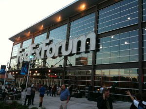 For the second straight season, I bought Grizzlies season tickets. I parked in my same parking lot on Linden between 2nd and 3rd, which is $10 (my ticket to the game is also $10). I arrived at FedEx Forum just before 6pm, got my free Beale Street blue Memphis Grizzlies 10th season tee shirt, bought my $7 refillable souvenir sweet tea and arrived in my seat in section 203 row A. I realized that my Grizzlies season ticket seat is in about the same location as my Ravens season ticket seat was in Baltimore when I lived there – up top, in the corner, above the players tunnel.