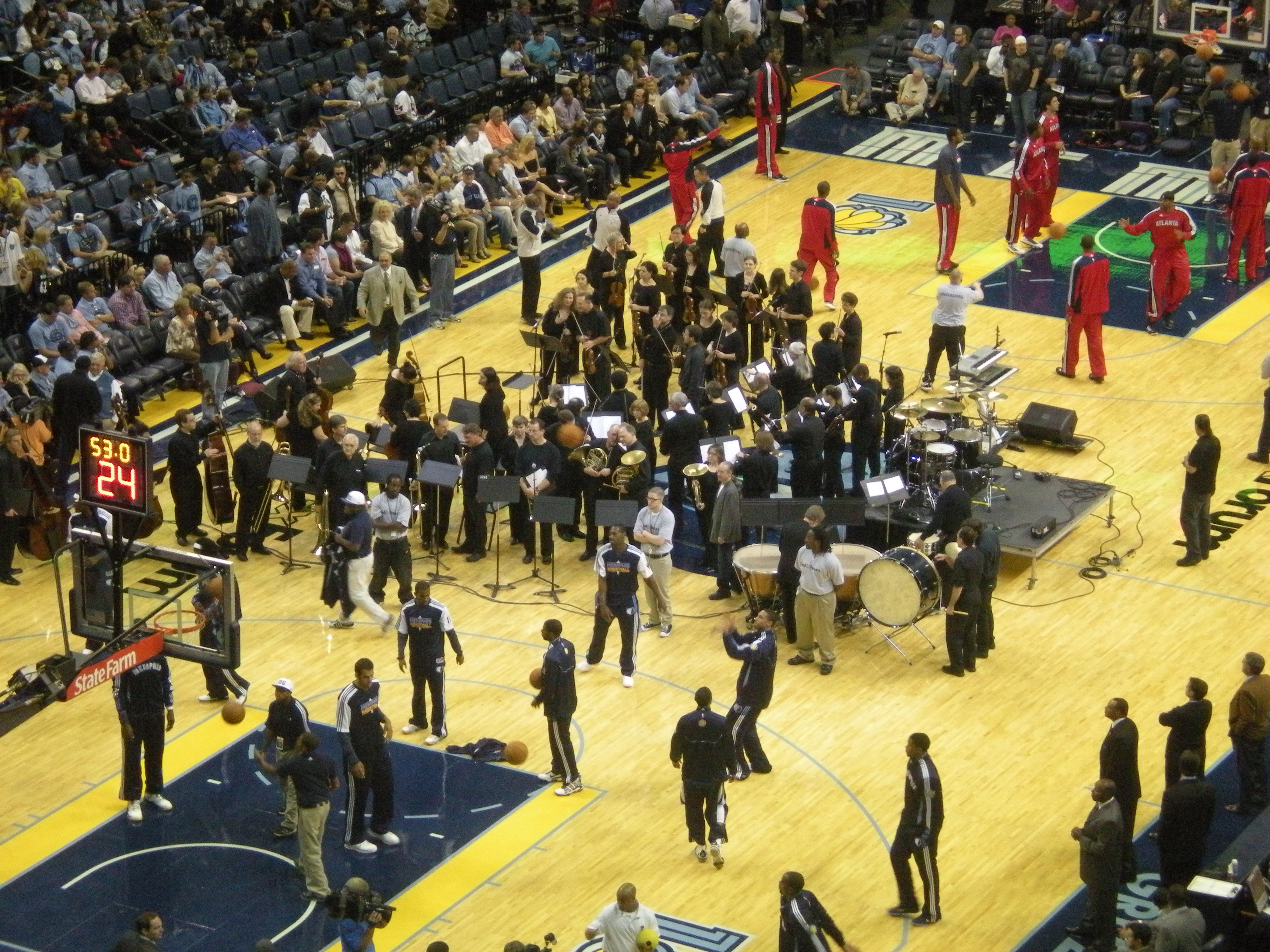 It was 45 minutes before gametime and the arena was empty. Gary Goin, the houseband, played a couple songs. Then around 7, after the national anthem and before the player introductions, Memphis’ own Al Kapone performed with the Memphis Symphony.