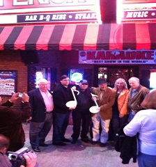 went to watch Chips Moman and Marty Lacker get their brass notes on the Beale Street Walk of Fame in front of Superior Bar. I wanted to see this because I have never seen this ceremony before and because Chips and Marty were both very important to Elvis. Chips was instrumental in Elvis’ American Studio sessions in 1969, which produced “Suspicious Minds” and “In the Ghetto.” Marty was a close friend of Elvis’. For more about this event, please read my article at http://www.examiner.com/cultural-events-in-memphis/chips-moman-and-marty-lacker-recognized-with-music-notes-on-beale-street