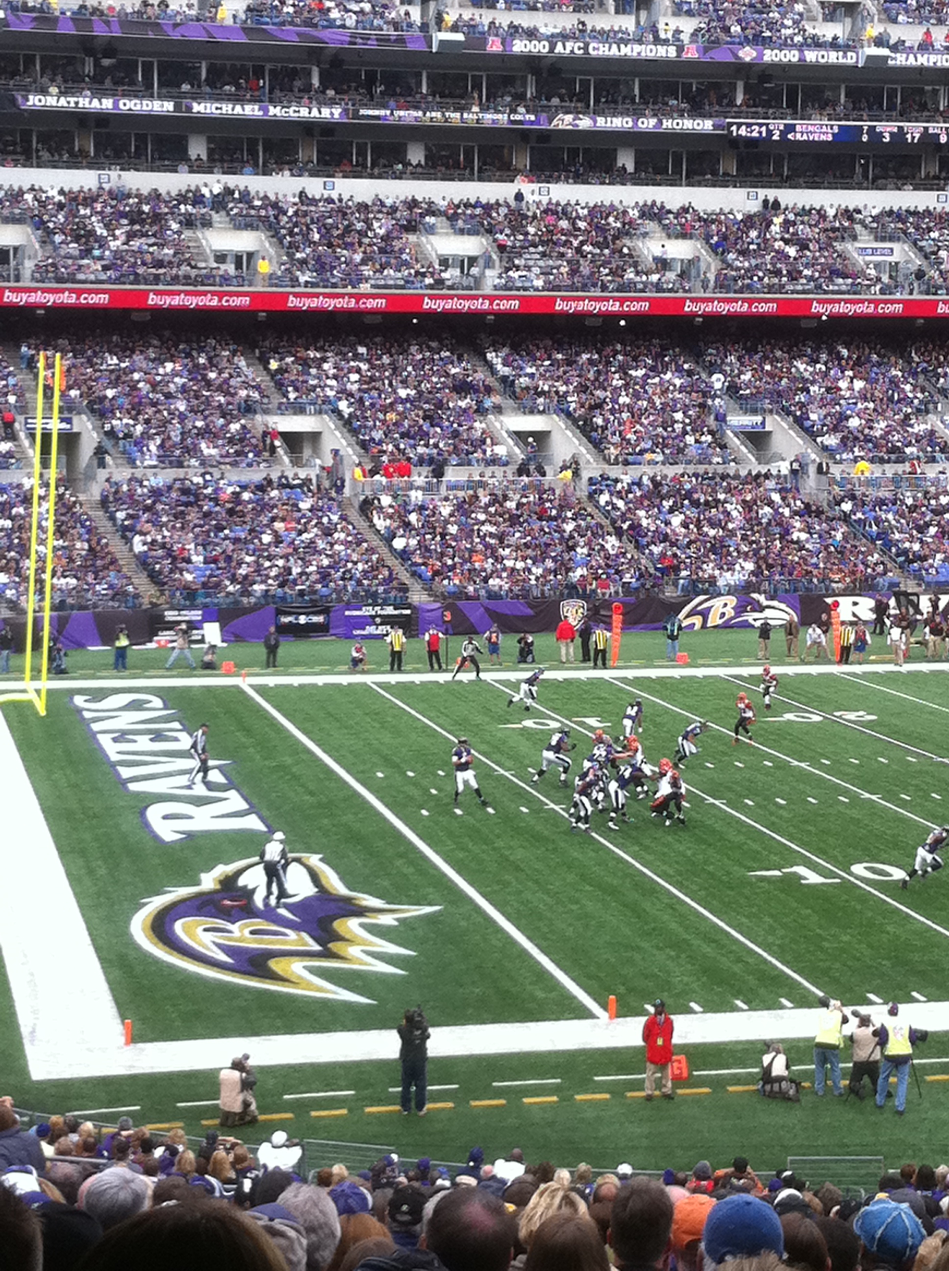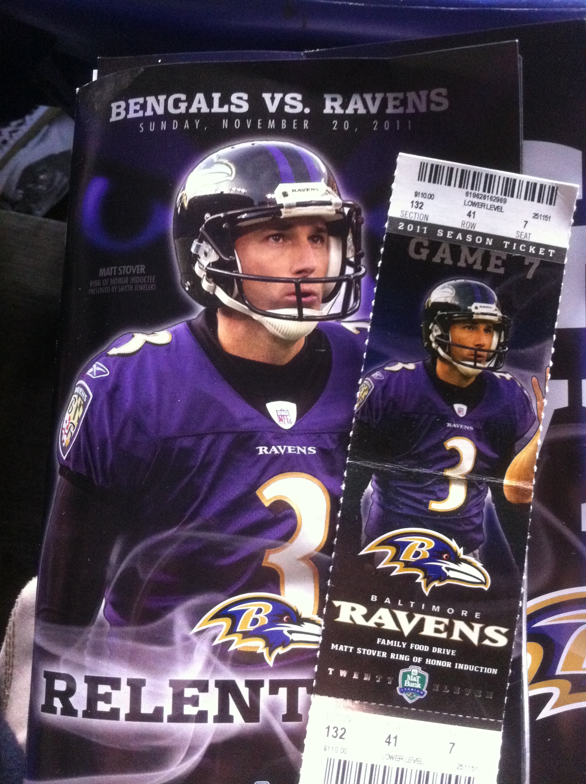 Dad and I took the bus from the park and ride in Catonsville and were at the stadium by noon to watch the Ravens – Bengals game. The last time I was at M & T Bank stadium was June 22 for the U2 360 show. I enjoyed being at the game, but I would much rather be there for a U2 show. But I did get to hear 3 U2 songs while I was there. The Ravens are introduced and run out on the field to Where the Streets Have No Name, Sunday Bloody Sunday was played in the first quarter and Vertigo was played at halftime.