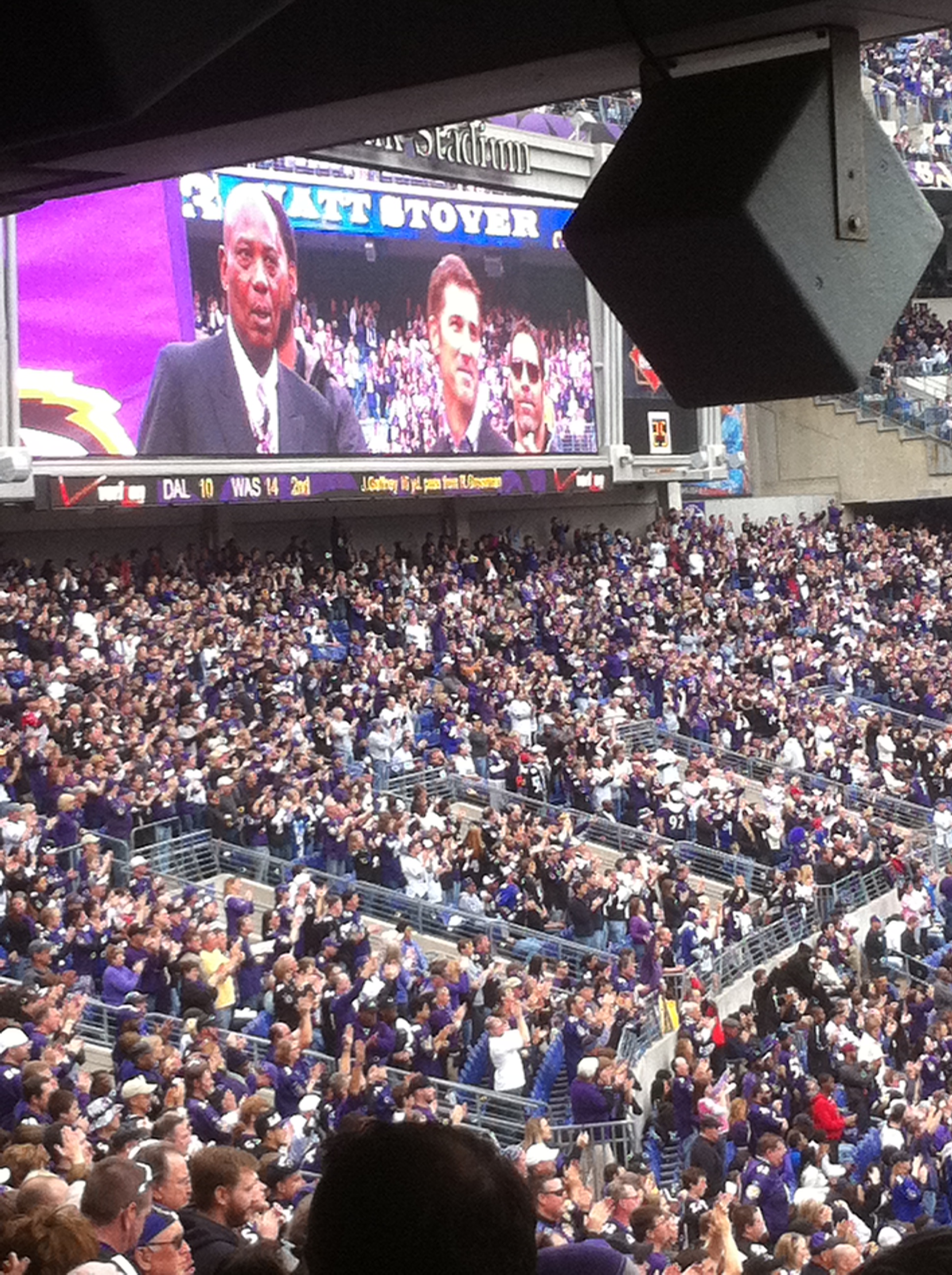 Even though Ray Lewis didn’t play (first time since 2007), it was a good game. The Ravens defeated the Bengals 31-24. The Baltimore defense had 3 interceptions. I saw the Bengals defense tackle Ravens #82 Torrey Smith by his hair – pulled him down by his hair. I always said they should make them tie up their hair and tuck it into their helmets. George Clooney (a Bengals fan) was at the game with his girlfriend, Baltimore native Staci Kiebler – I did not see them. Matt Stover got his name on the Ravens Ring of Fame. He is the lead scorer in Ravens history, and he was a kicker. I remember the season the Ravens won the Superbowl, Stover was the only one who scored when the Ravens went several games without a touchdown. My friend and I used to call Stover ‘hairspray’ because his hair was always perfect, even after he took off his helmet. And today was no different – not a hair out of place.