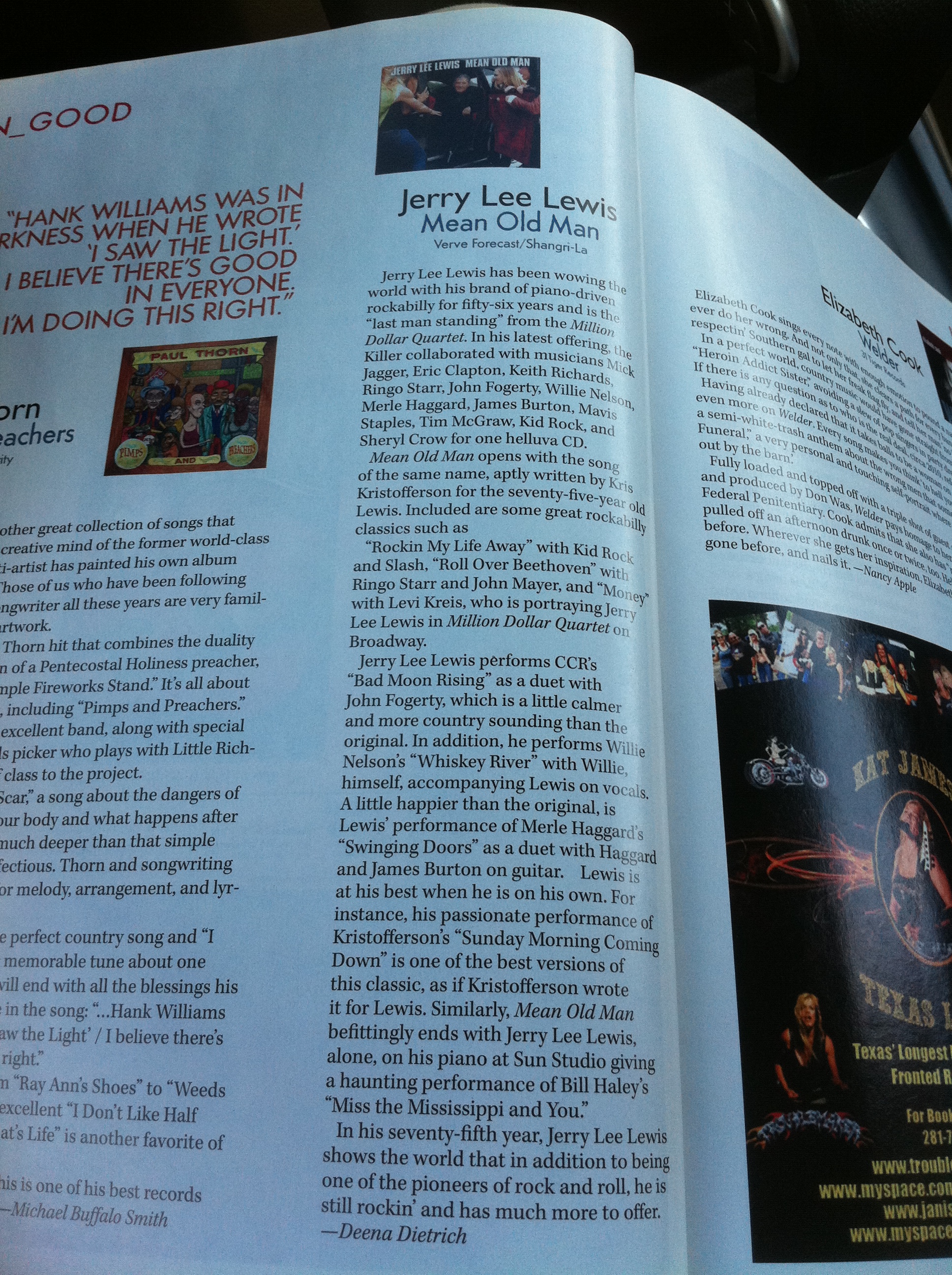Although 2011 was consumed with U2, I did manage to squeeze in a few other activities. In January, I became a published writer, celebrated Elvis Presley’s 76th birthday, saw some Grizzlies games in style and started my On the Road with U2 blog. On January 7th, I scoured the book stores for a copy of the new Twisted South magazine because I had written a review of Jerry Lee Lewis’ cd Mean Old Man – my first (and only so far) published article.