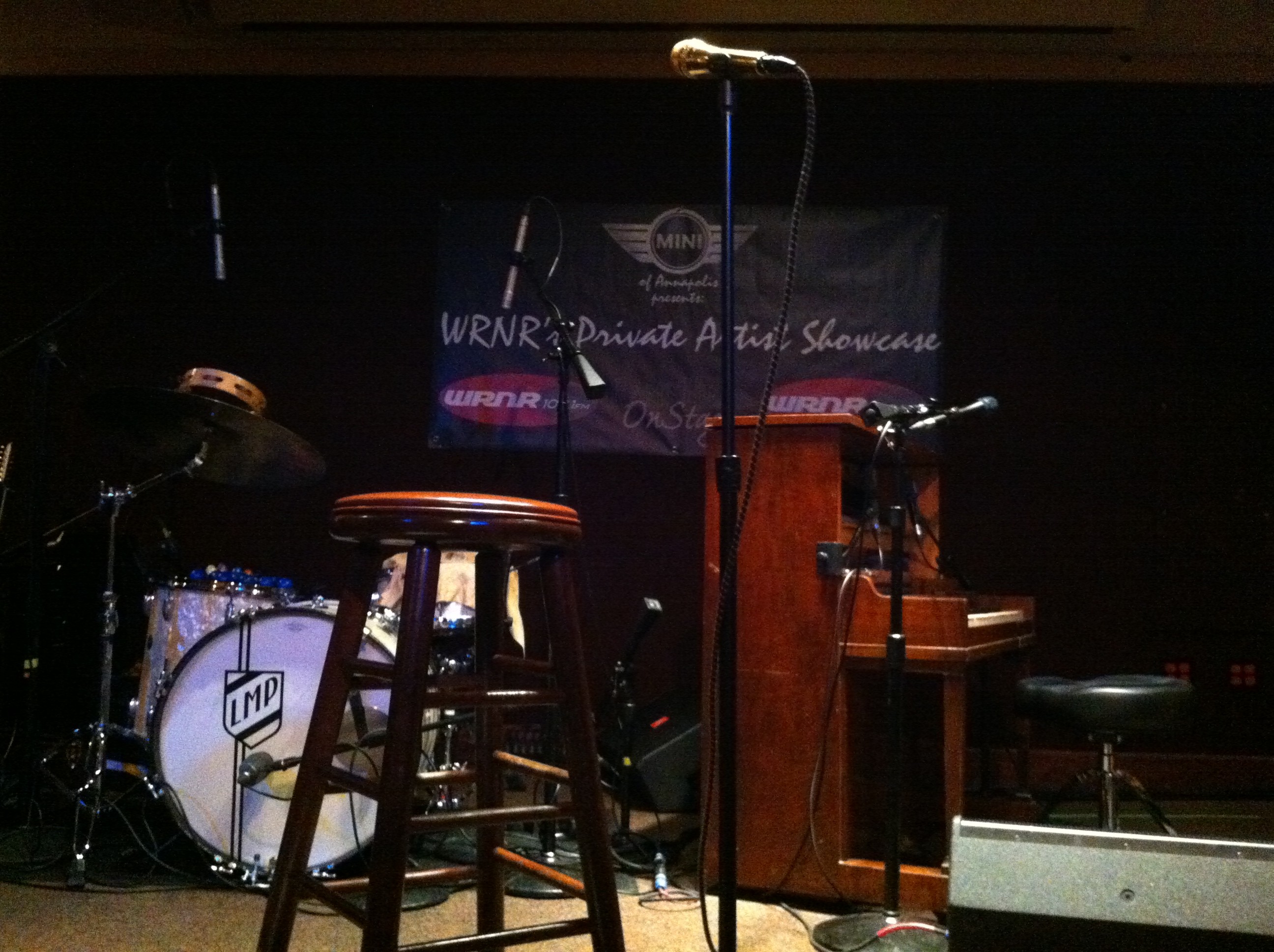 I started off my LMP Day in Annapolis at 11am. I arrived at Rams Head on Stage to find the band’s tour bus parked out front. I went inside and only one person waiting for Lisa Marie Presley’s Private Artist Showcase put on by the great radio station WRNR. I couldn’t believe there wasn’t a line of people waiting for this free, intimate performance. I won free passes to this event just by filling out a form on their website. By noon, a line had formed and we were still waiting outside. We were told that Lisa was late and we would be let in soon. I got a table right up front, and I mean literally on the stage. My knees touched the stage, which was very low. Lisa’s microphone was directly in front of me. She took the stage around 12:45, almost an hour after the show was supposed to start. When she walked out, she looked a little startled and as she sat down in front of me she said, “Wow, you’re so close!” After the opening song of Weary, she asked for the lyrics to the next song. A guy from WRNR gave me her cd to hand to her. Lisa said she doesn’t really look at them, but likes to know they’re there in case she needs them. Then she went on to say she was late because her bus was parked in Baltimore, so they had to drive her to Annapolis. She said she had no idea the two venues were so far apart – it’s at least a 30 minute drive, but more with the Sailabration traffic in Baltimore. Lisa then played Storm and Nails and closed with Over Me. I was singing right along with her on Over Me, as it is my favorite song off Storm and Grace, and Lisa spotted me singing (since I was inched from her face) and smiled at me. There was a huge applause from the 150-plus seated audience, and Lisa seemed really touched – she bowed as she left the stage.