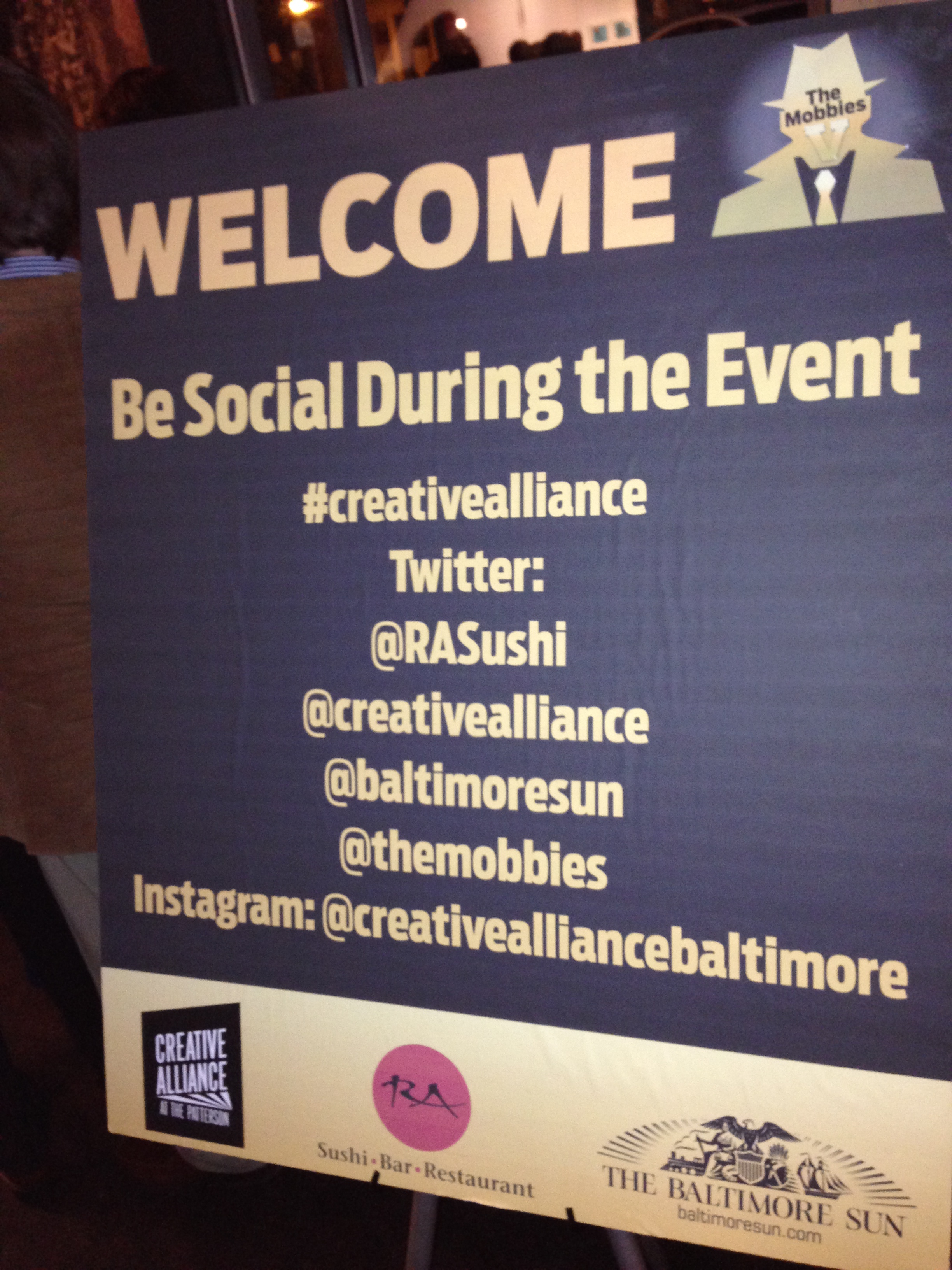 A great time was had by all last night at the Baltimore Sun‘s 5th Annual Mobbies. For 10 days, online voters chose Maryland’s best blogs and social media accounts. The reception and awards ceremony was held at the Creative Alliance in Highlandtown, the old Patterson Theater, and was catered by RA Sushi.