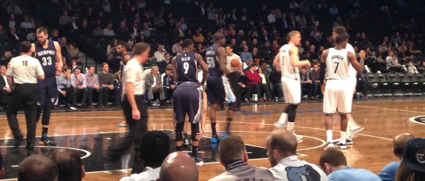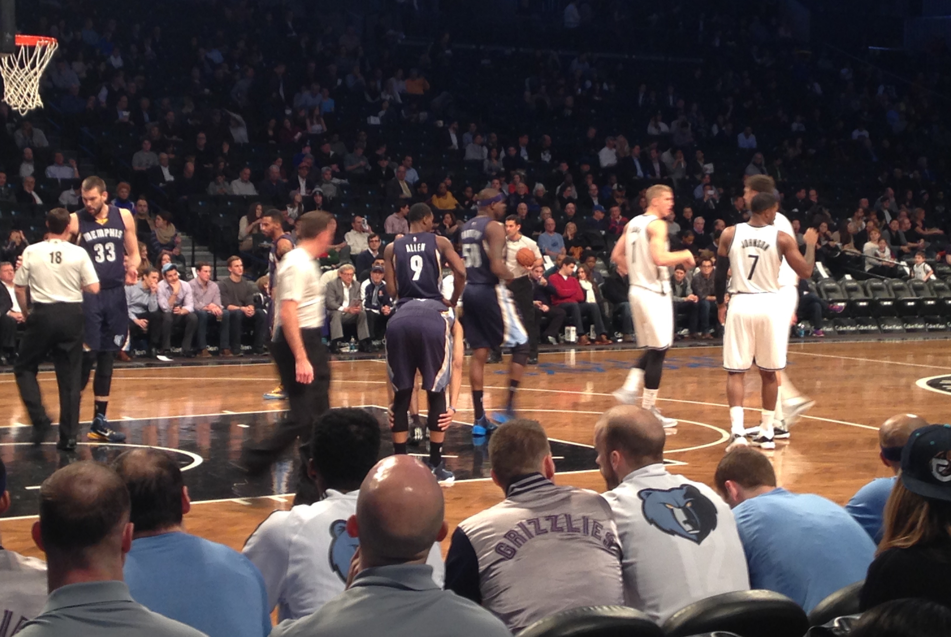 We went into Barclays at 6pm when the doors opened – tip off was at 7:30. A lot of people were already inside, so maybe the doors opened a few minutes early. Our seats were where they always are when I go to an away Grizzlies game – front row between the Grizzlies bench and the tunnel. Although this time it was a little different. We were REALLY close to the Grizzlies bench – closer than I’ve been in Philly or DC. Apparently I was on tv the entire game. But we weren’t next to the tunnel – that was a section over. I didn’t talk to any of the players this time, but Gasol and ZBo gave us the nod – as I screamed their names. Apparently our tickets came with free food – even a free buffet, but we had just eaten so we didn’t take advantage of it. I did get free iced tea from the concessions, but no big cups. Barclays Center does not have large drink cups – no souvenir cup. The drinks come in 12 oz cups. Supposedly because of the law NYC passed trying for less sugar drinks. I found it annoying and I blame my dehydration the next day on it (couldn’t have been the bottle of wine I drank at dinner.) There were quite a few Grizzlies fans in Brooklyn Wednesday night. And the Nets fans were great! They couldn’t have been nicer. They didn’t yell at us, make fun of us or boo us they like do in Philly and DC.