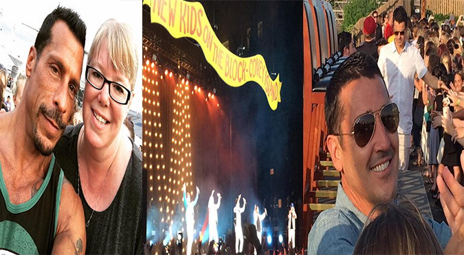 They finally let us in to the grassy knoll behind the stage. I was just going to hang back and sit one of the three picnic tables they had, but then I saw five chairs on the platform at the top of the hill next to the fence. I immediately went to the side of the chairs and was about four people back. NKOTB of course didn’t come out until about 6:45pm. Jon was the closest chair to me then Jordan then Joe then Donnie then Danny furthest away. When Jon came out he again gave me a cute little wave like right in my face – he was trying to shake my hand but it was just too crazy. So this ‘PreParty’ was more of a Q n A session than a party. The guys answered questions from the fans for almost 45 minutes. Some questions were ridiculous and some fans were really greedy just wanting one on one stuff from the guys. Let’s remember we as fans are not owed anything. NKOTB does not have to do events like this – and this one was free. Joey kept it real as did Donnie – both sort of telling some of the fans as subtly as possible to chill and not be greedy. After the Q n A, the guys walked along the fence to get selfies with everyone. Danny was the only who came to our side, so I decided to wait for him even though I love Jordan now I had loved Danny in high school (I even had the Danny pillow case). Danny came over and I thanked him and he took a really cute selfie of us.