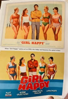 Another Lobby Card, the one with Elvis standing on the ‘beach’ with two girls on both sides of him, was used as the splash screen (aka the menu) for the Girl Happy dvd. Why in this beach movie is Elvis always in long sleeve shirts and long pants, on the beach and even while he is water skiing? He was not overweight, so I am not sure if it was his choice or the producers – no reason in any book was ever given. Another question, is this the only movie where Elvis is in drag?