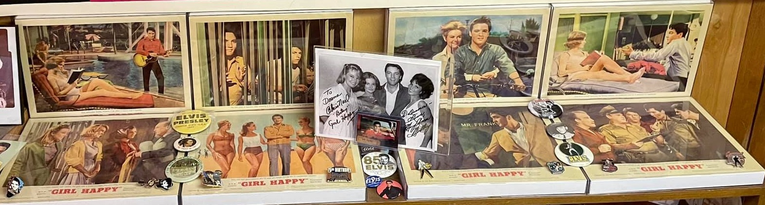 I have built up quite the Girl Happy memorabilia collection over the years including (but not limited to) the original 24″x 80″ Girl Happy banner, all 8 US Lobby Cards, 1 UK Lobby Card, Exhibitor’s Campaign Book from MGM, the MGM Press Book, original post card, original cast photo signed by Mary Ann Mobley and Chris Noel, original photo of Elvis and Shelley, original newspaper advertisements, 10 original soundtrack acetates from MGM, the 1965 original issue vinyl album, the reissue vinyl album, the FTD Girl Happy sessions (with the outtakes) on cd and iTunes, a Girl Happy record purse (as in a purse made from the actual vinyl record and cover and of course an autographed copy Chris Noel’s book Filming Girl Happy (that was Sandi Pichon’s). To see photos of all of Girl Happy memorabilia close up, please click here.