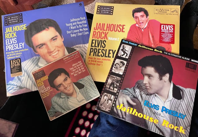 The songs from Jailhouse Rock were always favorites of mine growing up. Today my favorite off the soundtrack is a tie between “Don’t Leave Me Now” and “I Want to Be Free.” I also really enjoy “(You’re So Square) Baby I Don’t Care” (probably because of the pool party scene – love when Peggy says “Every time I see you you’re working a neck” when she spies Vince kissing a girl’s neck). I have four versions of the Jailhouse Rock soundtrack on vinyl. I have the original 7-inch 45rpm from 1957 (which for some reason “Treat Me Nice” was left off), a reproduction of the South African 12-inch 33 1/3 rpm release from 1958, the FTD double album of the Jailhouse Rock sessions (which is amazing – SO much Elvis talking and laughing) and the 10-inch double French release Jailhouse Rock The Alternative Album. Four hours one afternoon Jerry Leiber and Mike Stoller wrote four of the six songs for Jailhouse Rock: “(You’re So Square) Baby I Don’t Care,” “I Want To Be Free,” “Jailhouse Rock” and “Treat Me Nice.” “Jailhouse Rock” entered the Billboard‘s Top 100 in October 1957 at #15 and was #1 within three weeks where it remained for seven weeks. “Jailhouse Rock” (with “Treat Me Nice” on the flip side) stayed on the charts for 27 weeks – that is over half a year. “Treat Me Nice” peaked at #18.
