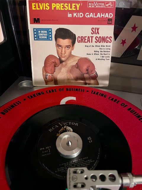 Elvis sang six songs in Kid Galahad. They were were “King of the Whole Wide World,” “This is Living,” “Riding the Rainbow,” “Home is Where the Heart Is,” “I Got Lucky” and “A Whistling Tune.” “Love is for Lovers” was cut from the movie. “A Whistling Tune” was recorded for Elvis’ previous movie Follow That Dream, but was not used. The soundtrack, which was recorded at Radio Recorders in Hollywood in October 1961, was released as an EP on September 17, 1962. I have that original 45 rpm record. This is the first Elvis movie that does not have a title song. There is no “Kid Galahad” song. Instead, Elvis sings “King of the Whole Wide World” during the opening credits. It was not released by RCA as a single, but remained on Billboard‘s Hot 100 chart for seven weeks peaking at #30. Although this dramatic movie may have worked better without the fan-demanded Elvis songs, “Home is Where the Heart Is” actually does work because it is not solely focused on Elvis’ singing. He is puttering around with his car and flipping through a book and then it shows Dolly longingly looking at Rose and Walter, which helps sets the romantic mood. Now Elvis singing “Riding the Rainbow” to two of his guy friends while driving to a boxing match is a little more farfetched, although many people do sing while they are driving.