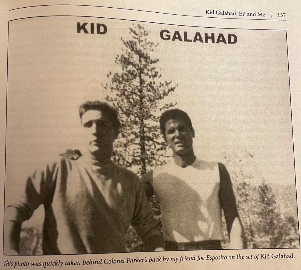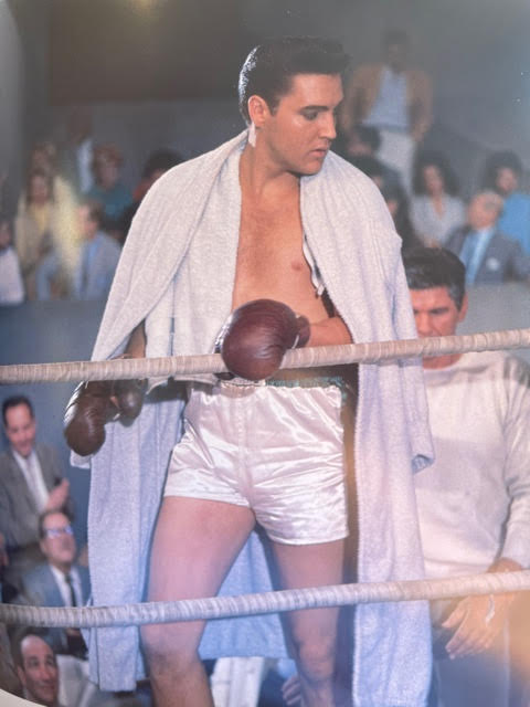 Michael Dante played Walter’s boxer friend Joey. While rehearsing, Elvis accidentally punched Michael in the face and couldn’t apologize enough. Elvis invited Michael to one of his weekend trips to Palm Springs with him and the guys. Elvis rented the top floor at Howard Manor. I met Michael at Elvis Week 2018 when he signed his memoir for me. He was very friendly. Robert Emhardt, who played Maynard the cook, also played the banker in Elvis’ last movie Change of Habit. Ned Glass, who played Max Lieberman owner of the place where Dolly used to sing, also played the hotel desk clerk in Elvis’ King Creole. Orlando de la Fuente, who played Sugarboy Romero, was an undefeated 18-year-old welterweight boxer. Jimmy Lennon, who announced two fights in Kid Galahad, was an actual fight announcer at the Olympic Auditorium in LA. World Champion Junior Welterweight Boxer Mushy Callahan coached Elvis in the boxing scenes. Twenty-four years earlier, Callahan had also trained Wayne Morris in the original 1937 Kid Galahad movie. Callahan said Elvis was a quick learner and with enough time he could make him “a contender.” Other real life boxers were also hired to help train Elvis and also had parts in the movie. They all said Elvis was quick with his hands, but slow on his feet standing with a wide stance due to Karate background. Elvis’ part was rewritten to fit his particular skill set.