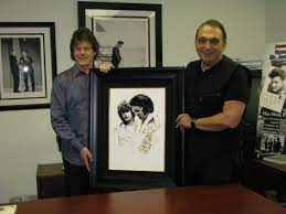 Fast forward eight years to the opening of the new Elvis Presley’s Memphis in March of 2017. This is what I wrote about it … “We had been at EPM since 8am and it was almost 6:30pm and we still had not seen the new museums yet – just the quick walk through before lunch. We started in the VIP lounge and exhibit. I was very excited to see my favorite Joe Petruccio painting on the wall – the one with Jerry Schilling and Elvis (autographed by Jerry!). I have admired this painting since 2009 when I met Joe right after he painted it and was showcasing it at Graceland Crossing. Joe painted it from a photo that Jerry used on the cover of his memoir… The next day I walked over to the VIP Exhibit where the Elvis Fashion store is to see if I could buy that Joe Petruccio Jerry and Elvis painting. And yes it was for sale, and just a little over what I was willing to spend, but I bought it anyway. I had wanted that painting for eight years. I am SO excited! They are shipping it to me. As much as I wanted to take it with me, it was just too big to take on the plane and not get damaged.” This painting called “You’ll Never Walk Alone” now hangs proudly on my wall, and I admire it everyday. Joe told me it was the last one in circulation. I have number 18 out of 25. Jerry of course has the number 1, and it is hanging on the wall in his house. Joe did paint it from a photo taken back stage in 1972 (the year I was born) of Elvis and Jerry that Jerry included on the cover of his book.