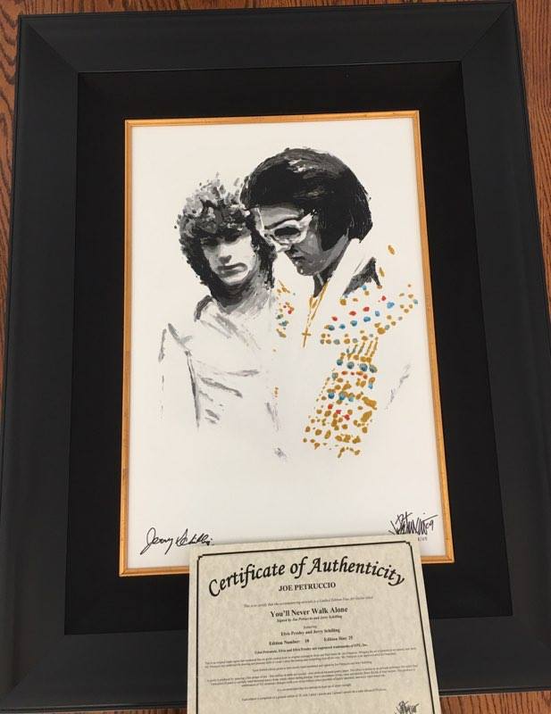 My story starts with my love for Jerry Schilling and a painting by Joe Petruccio. During Elvis Week 2009, I first saw Joe Petruccio’s beautiful painting of Elvis and Jerry Schilling. At the store next to where the Rock n Roll Cafe used to be in the old shopping center Graceland Crossing, I saw this beautiful painting for the first time. I spoke with Joe who was debuting his new painting of Elvis and Jerry Schilling (and I love me some Jerry!). I loved the painting, but could not afford to buy it, so Joe graciously allowed me to take a photo of it if I promised not to put it online, which I never did. I kept that photo and stared at it for eight years until I could own it. I did not know anything about the painting or that it was named “You’ll Never Walk Alone.” I am not sure why I did not recognize it from the photo on the cover of Jerry Schilling’s memoir.